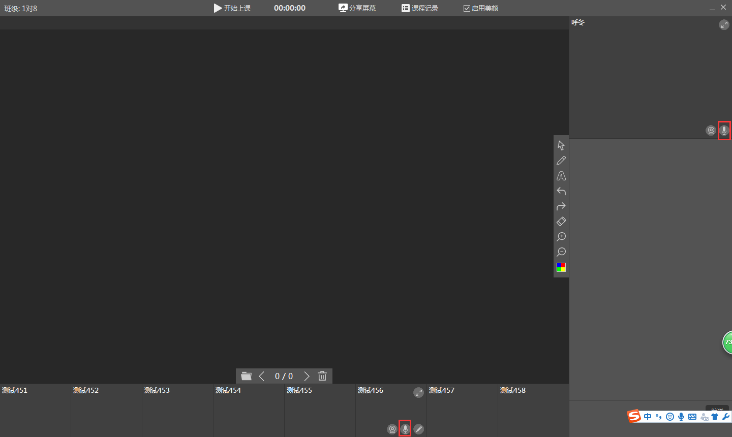 在老师和学生视频画面的右下角,点击【麦克风】按钮,控制麦克风的开/关。(老师可以开关自己和学生的麦克风,学生不能操作)