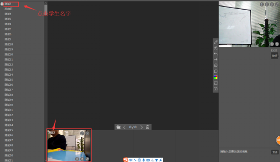 在大班课的时候,老师要随机选择学生上台进行互动,只需在左侧学生列表中点击学生名字,软件会自动把该学生请上台,并打开该学生的视频和麦克风,从而进行互动。 (注意:大班课的教室中最多同时显示4个学生,如需显示第5个学生,可以直接点击第5个学生的名字,第4个学生就会被替换成第5个学生。老师也可以自主选择关闭一个学生,然后再点击第5个学生。老师也可以把4个学生全部关闭,然后选择下一批4个学生。学生视频画面的右上角的×,即是关闭按钮)
