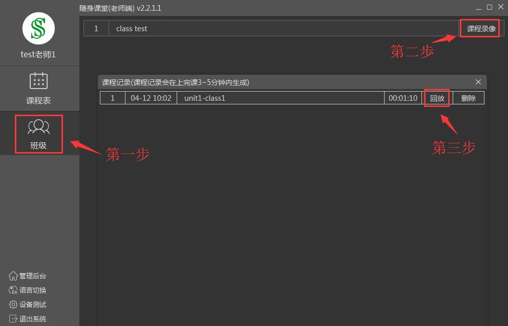 第三步 在课程记录列表中,选择要找的录像,点击【回放】按钮进行播放。
