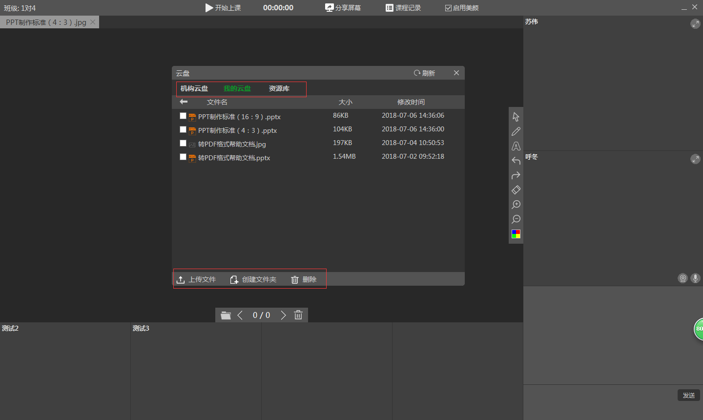 机构云盘:此云盘是机构所属,课件需要在后台的“云盘管理”中上传,上传后,授课老师才可再机构云盘中看到课件,并选择打开。授课老师仅能教学使用,不能删除、编辑或下载。