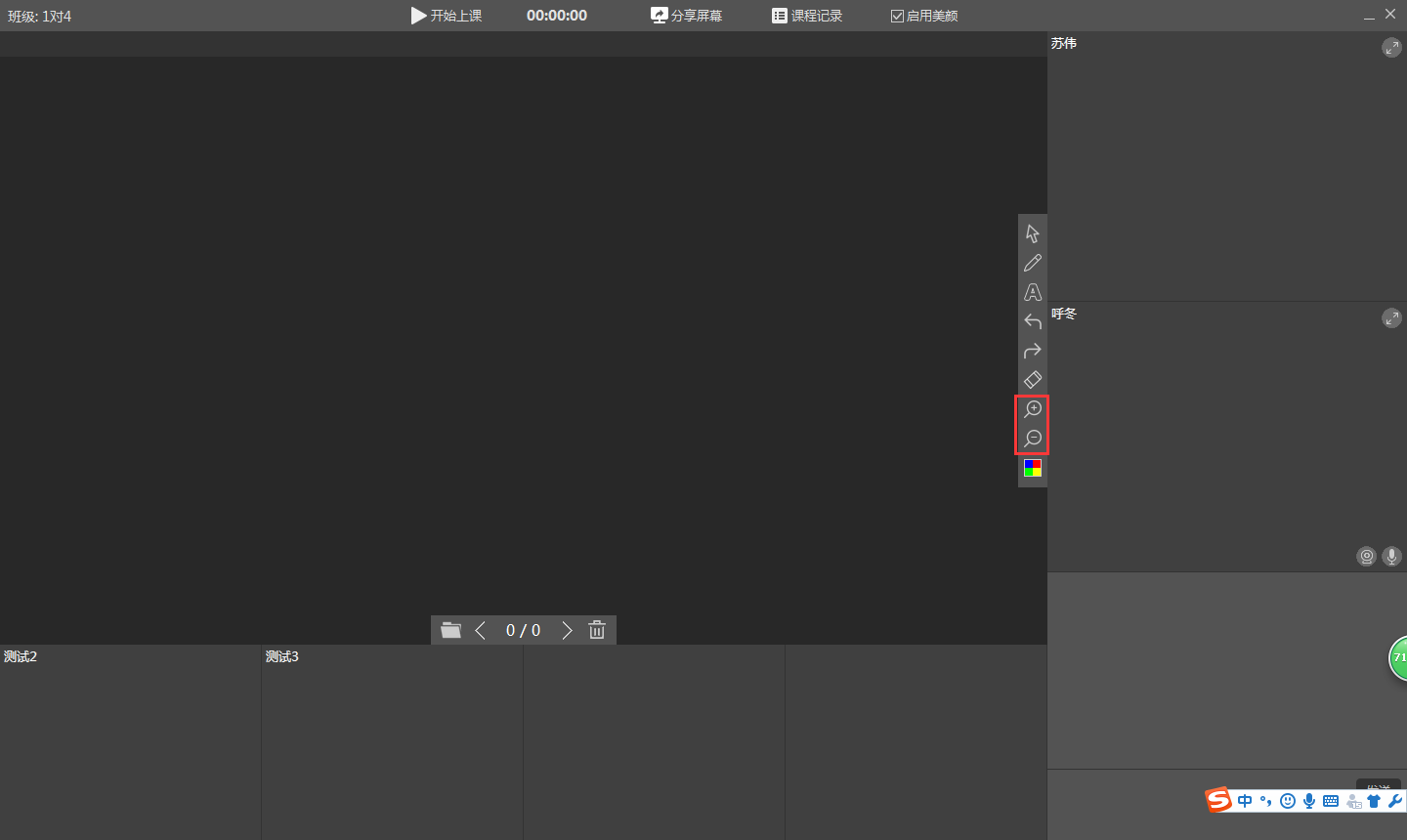 第一步,点击【放大/缩小】按钮,完成课件的缩放;第二歩,点击【截屏】按钮,把缩放后的课件同步给学生。(注意:每缩放一次或者拖动一次,必须要点击【截屏】按钮,否则学生的内容不同步)