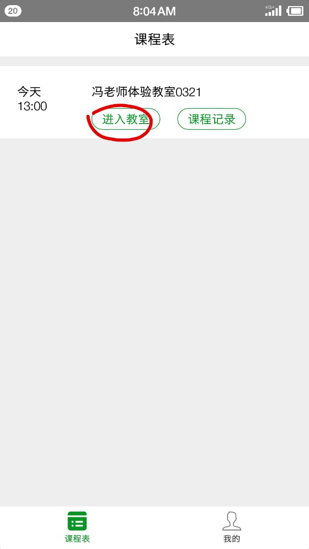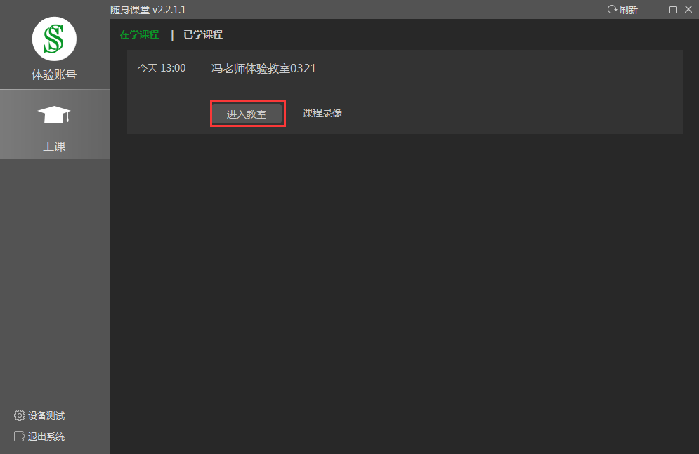 登录软件后,会显示自己所报名的班级列表,根据上课时间、班级名,选择进入正确的教室。点击【进入教室】按钮,即可进入当前班级教室,并开始上课。