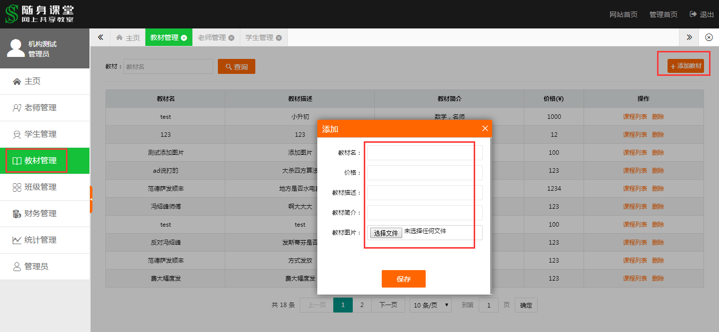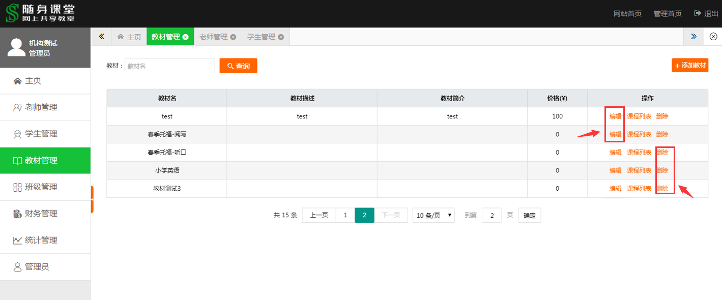首先进入教材管理页面,点击【添加教材】按钮,输入正确的教材信息,保存即可。在保存的教材列表中,选择需要编辑/删除的教材,点击【编辑】或【删除】按钮,可进行相应的操作。